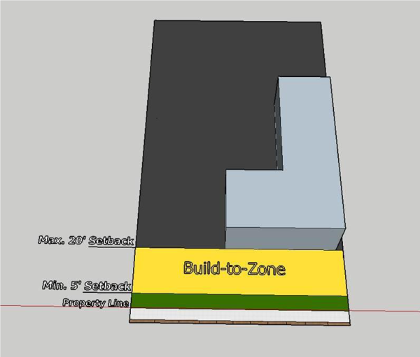 Build-to-zone: The area on a lot, measured parallel from the front and/or corner side lot line, where a building must locate within the minimum and maximum range of setback provided.