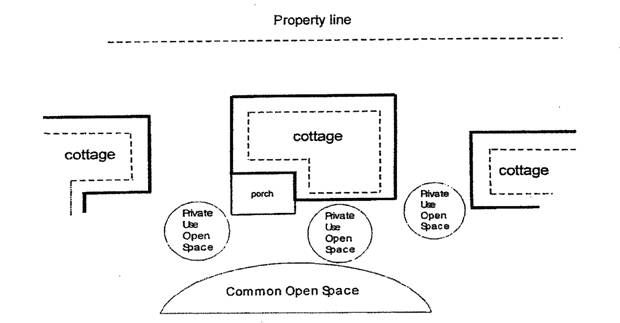 Private use open space should be contiguous to each cottage, for the exclusive use of the cottage resident, and oriented towards the common open space.