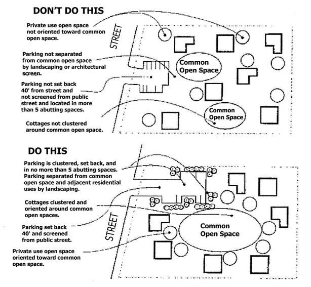 Avoid large clusters of parking, set back parking from the street, create functional common and private use open space, provide for screening of parking from cottages and common open space. The site should be designed with a coherent concept in mind.