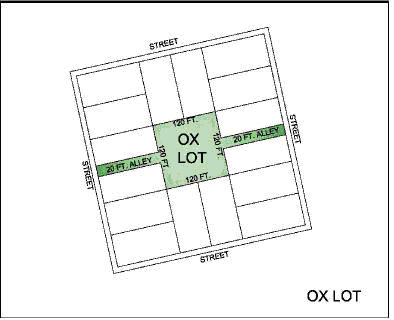 Oxlot. A parcel of dedicated public land within the original 20 symmetrical blocks laid out on a grid system oriented toward the Bogue Falaya River, today known as the Division of St. John. Each block, measuring 360 square feet, contains a small central square measuring 120 square feet and is connected to the adjacent streets with 20-foot alleyways.
