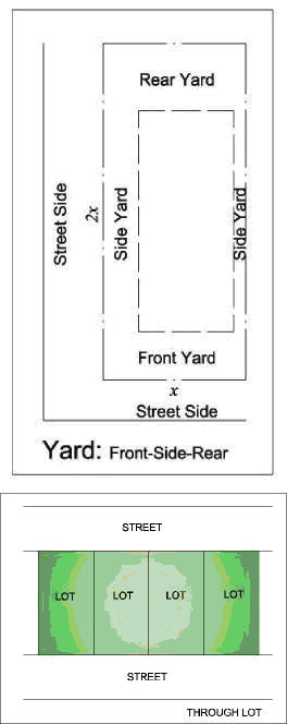 Yard, through. A through yard is any single zoning lot, including a corner lot, that connects two generally parallel streets. On through yards fronting two streets, two front yards shall be provided.