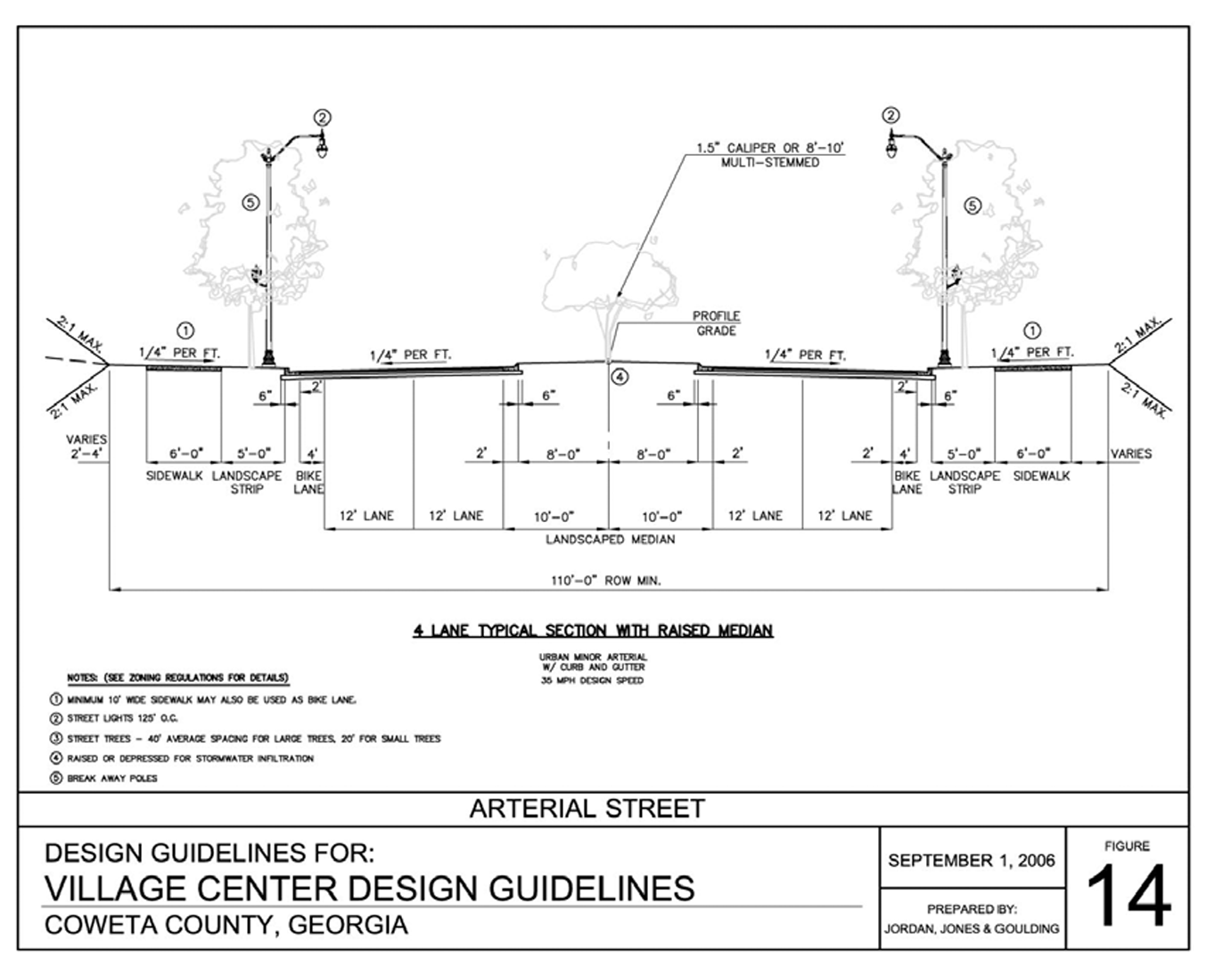 Arterial: A street classified as a principal arterial or minor arterial on the Coweta County thoroughfare map or a street meeting the standards of figure 14 of the village center design guidelines that functions as an arterial street by virtue of its role of providing access for through traffic passing between municipalities, village centers, or other major activity centers and connecting other arterial streets.