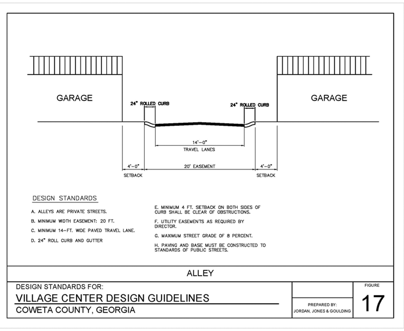 Alley: A secondary public or private way providing for vehicular and service access to properties otherwise abutting a public street. See figure 17 of the village center design guidelines.