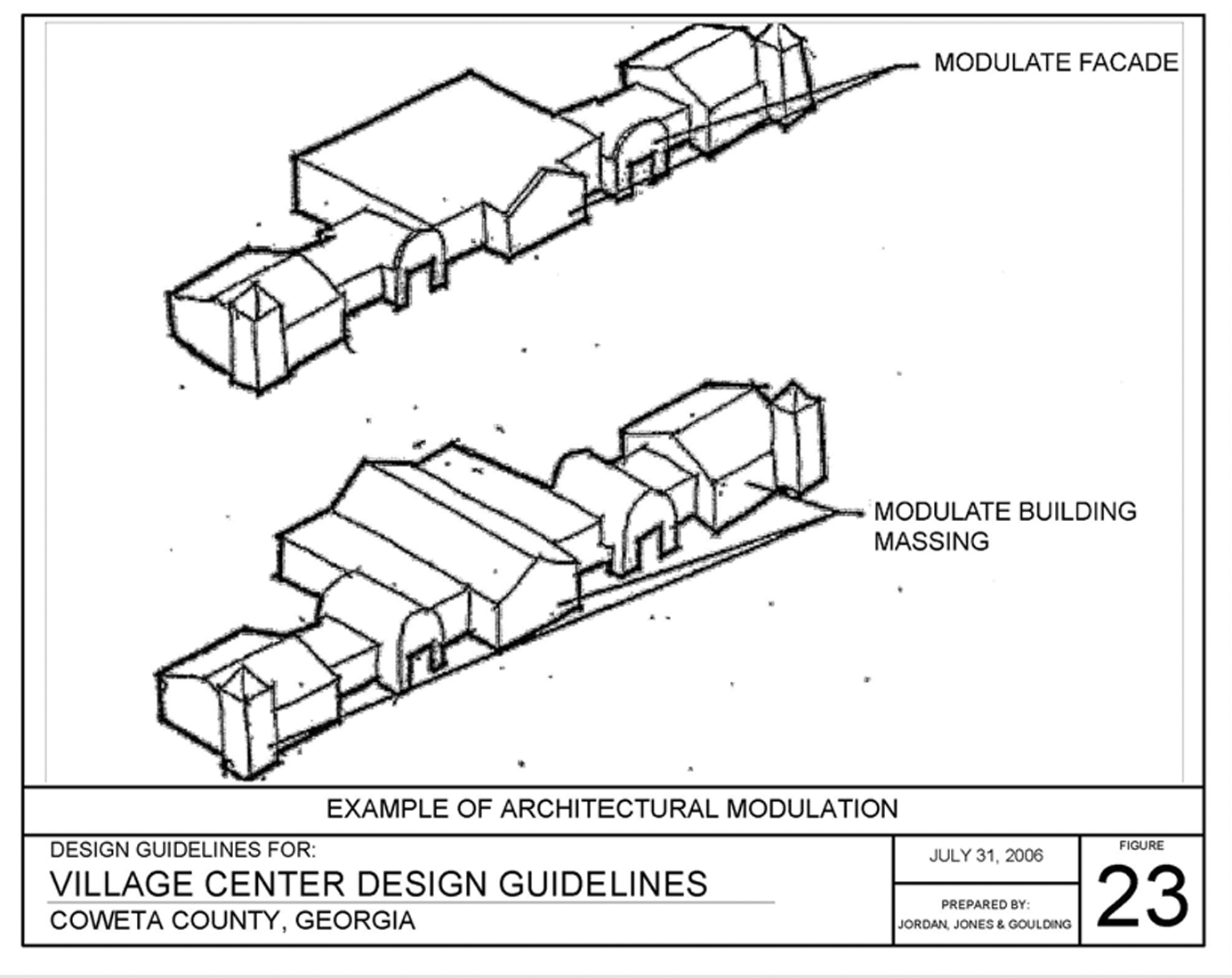 Architectural modulation: Variation in materials, massing, fenestration and ornamental detail of a facade that divides a facade into unique components or identities, as distinguished from a uniform facade without variation. Architectural modulations of a facade should break the vertical plane by more than two feet in depth, measured from the forward plane of the facade. See figure 23 of the Coweta County Village Center Design Guidelines.