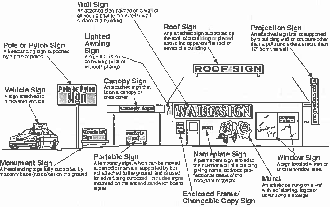 Wall sign means a sign attached or affixed to an exterior wall of a building or structure or dependent upon a building for support with the exposed face of the sign located in a place substantially parallel to the exterior building wall to which it is attached or by which it is supported and not extending more than 12 inches from said wall. A wall sign shall not extent above the wall or parapet to which the sign is attached. For the purpose of this section, awnings, canopy fascias, mansards extending along a building side shall be considered a part of the wall.