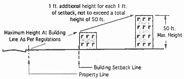 For every one foot exceeding the maximum permitted height, an additional one-foot of setback is provided on the front, side, and rear yards. The maximum height of a building shall not exceed 50 feet without a special exception.