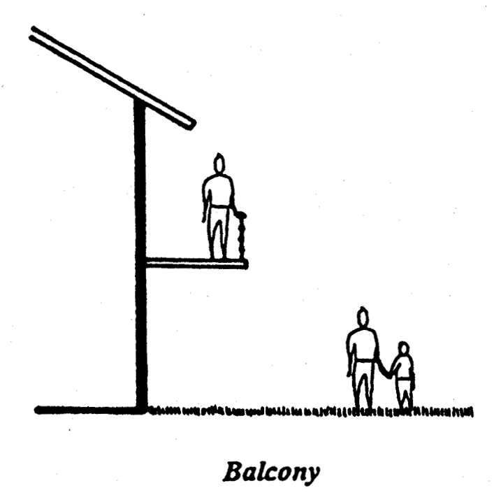 Balcony means an elevated platform open to the elements, not supported by the ground and projecting from an upper story and enclosed entirely by a railing.