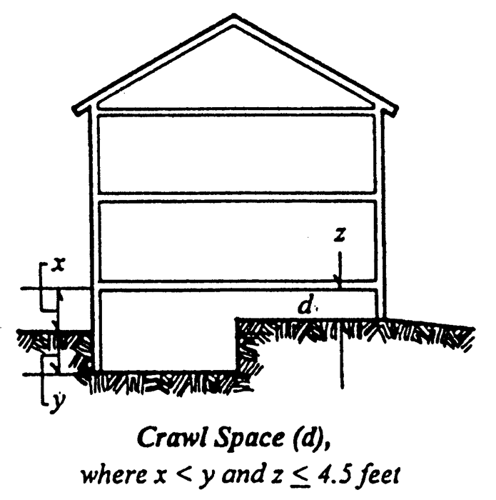 Crawl space means a space between the ceiling of one story and the floor of the next story above, which normally contains pipes, ducts, wiring and lighting fixtures and permits access but is too low for an individual to stand. A crawl space may be a cellar area no more than 4.5 feet in height, or, if between a ceiling and a shed roof or a flat roof, a cockloft.