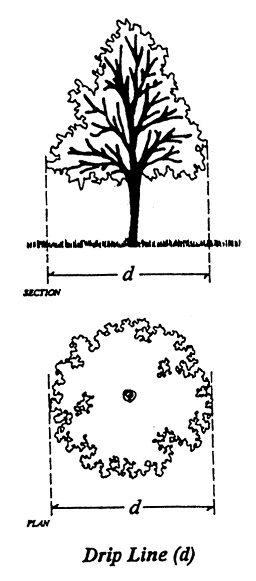 Dripline means the zone lying between the trunk of a tree or shrub and the extreme outer edge of the leaf and branch structure, i.e., the diameter of the leaf and branch structure extended vertically down to the soil surface.