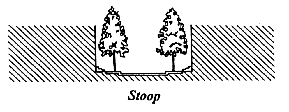 Stoop means a building frontage type where the building facade is aligned directly on the frontage line with the ground floor elevated to provide secure privacy at the windows.