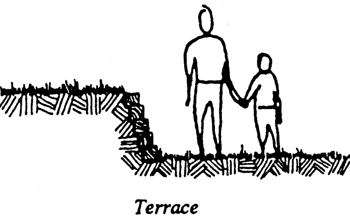 Terrace means a landscape treatment of mounded earth, rock wall, railroad tie wall or other retaining device used to modify steep grade differences on a lot. A terrace shall not include a patio or deck surface.