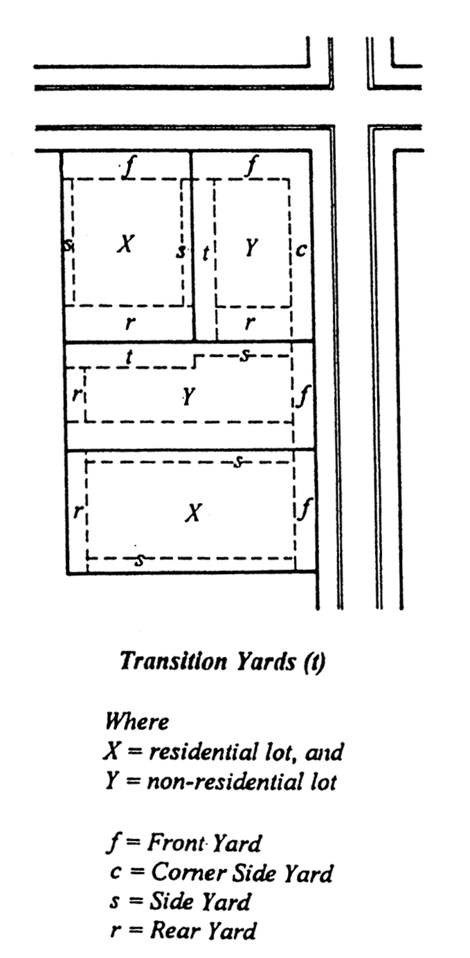 Yard, transition, means the required front, side, corner side or rear yard on a lot in a commercial or industrial district and an adjoining residential district, or the required front, side, corner side or rear yard for a nonresidential use and adjoining residential uses in a residential district, except when such yard is adjacent to a railroad right-of-way, alley or street.