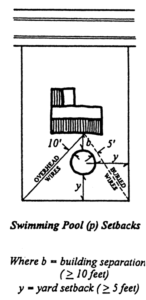 No swimming pool, hot tub, or outdoor spa shall be located within ten feet of any overhead electric distribution or aboveground service utility line transformer, pedestal or meter, or within five feet of any buried electric distribution or service utility line.