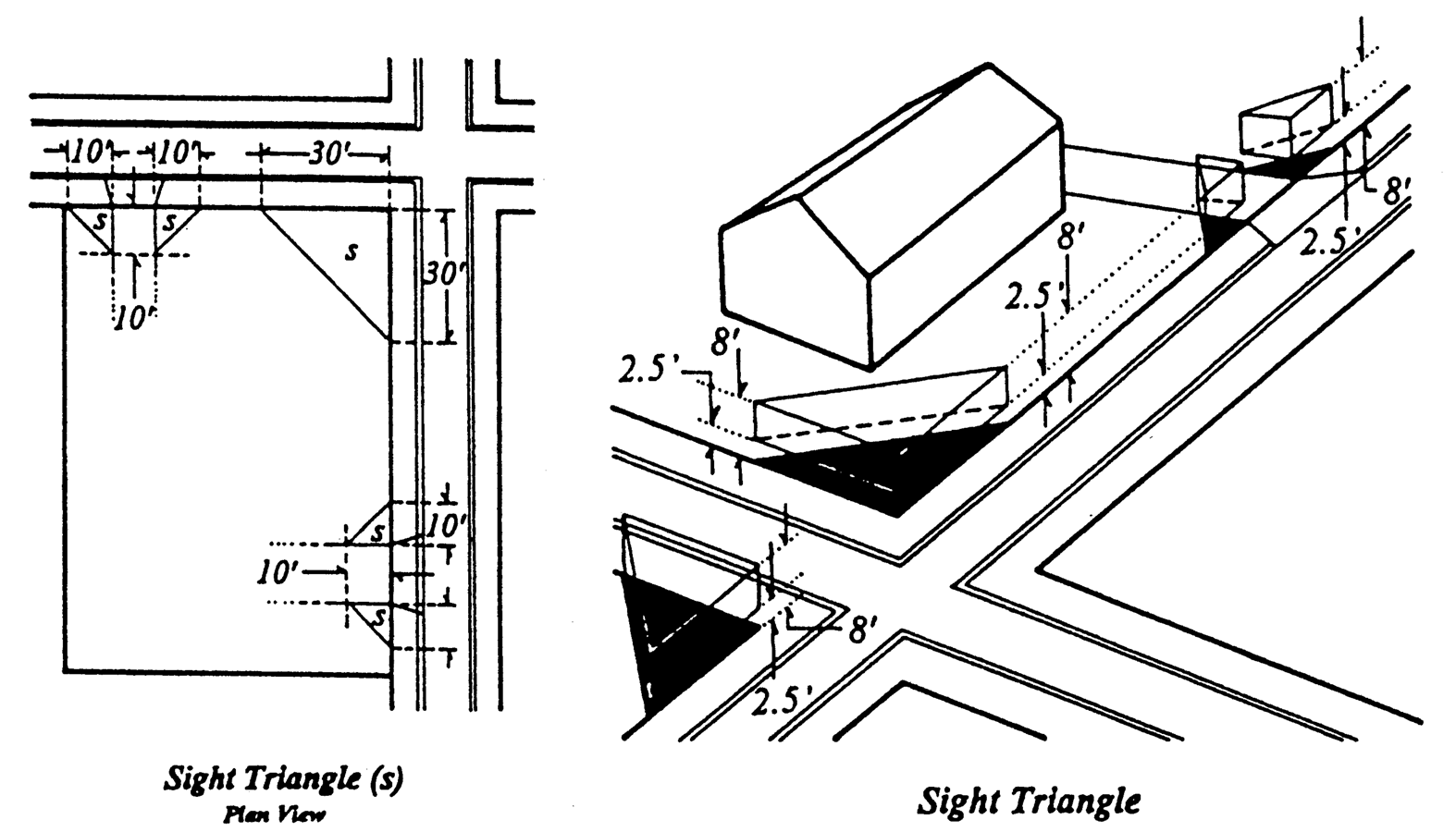 Fences, including walls, and planting material used in the nature of a fence, placed or maintained on any portion of any public right-of-way or in any required yard, which, by the nature of the materials used for its construction, design or location, would impair public safety by interfering with and obstructing the vision of persons using the streets, sidewalks or driveways on or adjacent to such a yard. No such fence may be located within the sight triangle, the sides of which are formed by the right-of-way lines of two intersecting streets or a street and a driveway. The length of the sides of the triangle shall be 30 feet along the street rights-of-way that intersect, and ten feet along the street right-of-way and driveway when a street and driveway intersect, or along the street right-of-way and alley when a street and alley intersect.