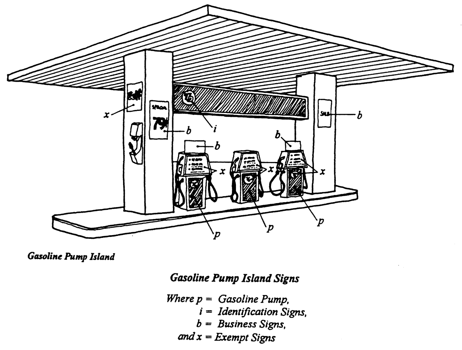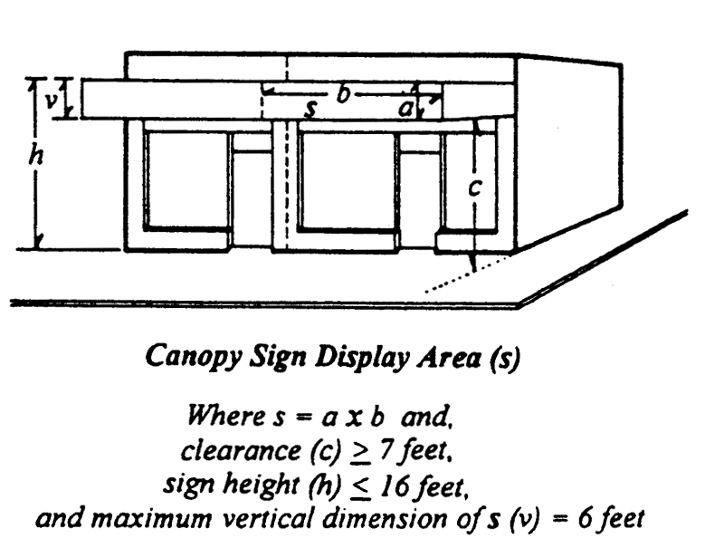 Business signs at each pump island, the total area of which at each pump island shall not exceed four square feet per gasoline pump. No such sign may be located more than eight feet above grade and each such sign shall not exceed three square feet in area. For the purposes of this section, a pump is the aboveground equipment used to dispense and measure multiple grades of gasoline for full-service or self-service use of the customer and may have one or more pump nozzles attached thereto for dispensing fuel to up to two cars at one time.