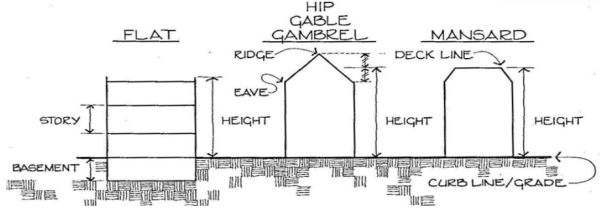 BUILDING HEIGHT. The vertical distance to the highest point of the roof; to the deck line of mansard roofs; and to the average height between eaves and the ridge for gable, hip, and gambrel roofs, measured from the average grade line of the building.