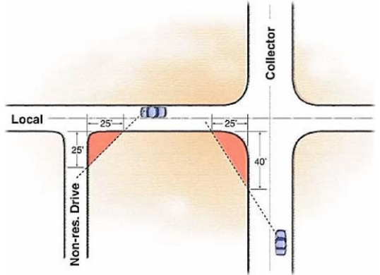 SIGHT TRIANGLE. No fence, wall, hedge, shrub, structure or other obstruction to view shall be erected, placed, or maintained within a triangle formed by the property line immediately adjacent to a street, road, railroad right-of-way, or nonresidential drives as illustrated in the figure below.