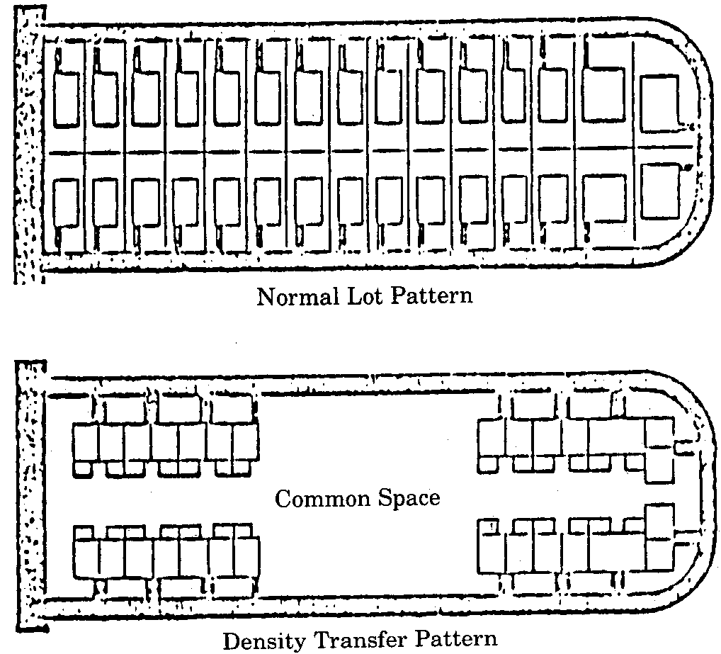 Density transfer of dwelling unit clustering: Within a planned unit development, this term refers to the substitution of common open space for private open space relinquished by waiver of minimum yard requirements for individual buildings. The average density in dwelling units per acre for the total planned unit development remains the same as permitted in the appropriate zoning district before the planned unit development designation is given. (See example 2.)