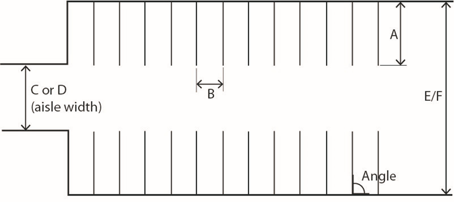 The minimum parking stall dimensions are illustrated in the figure below. Each letter in the figure is keyed to a corresponding dimensional requirement in Table 106.85-5.