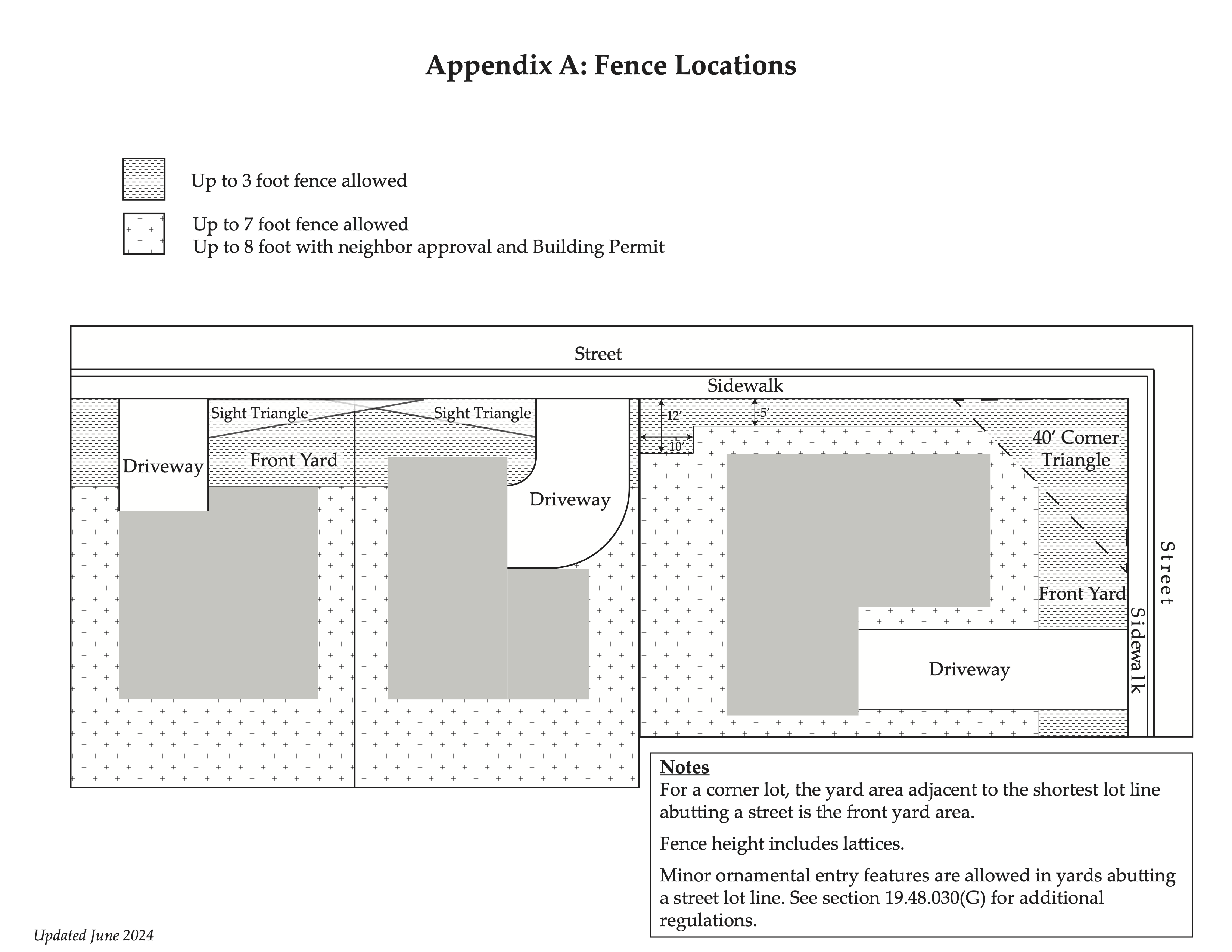 Table 19.48.030 sets forth the rules and regulations pertaining to fences on properties where design review is not required. Appendix A is a visual representation of the provisions of Section 19.48.030(A)–(C). The Director of Community Development is authorized to administratively make changes to Appendix A to clarify the intent of these provisions.