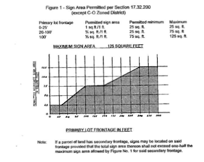 The total face area of the aforementioned signs shall not exceed the permitted area as shown on Figure 1, which is made a part of this section by reference; the maximum face area permitted for each business entity is one hundred twenty-five square feet; if parcels of land have secondary frontage, signs may be located on the frontage; provided, that the total sign area thereon shall not exceed one-half the maximum sign area allowed by Figure 1, for the secondary frontage.