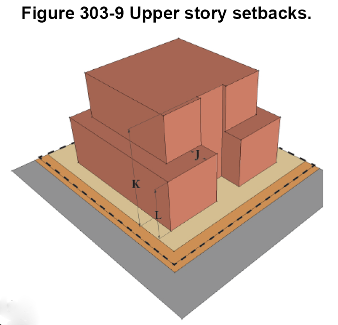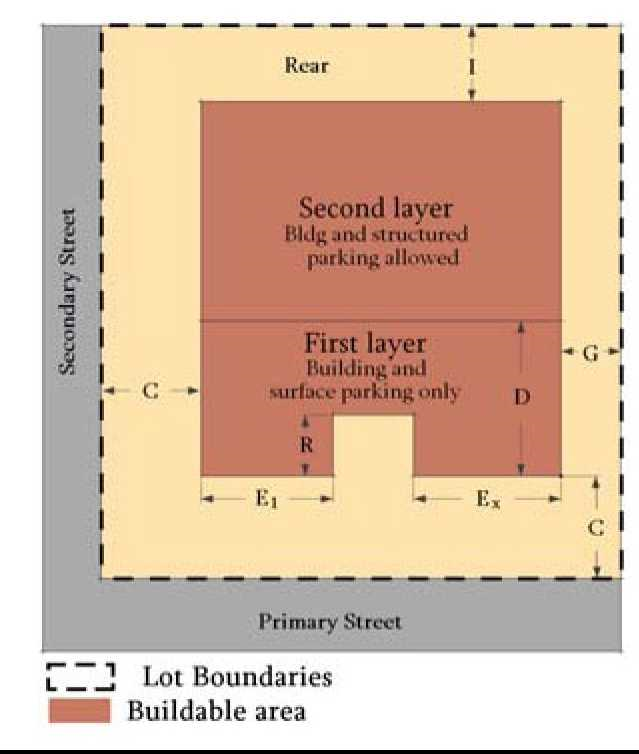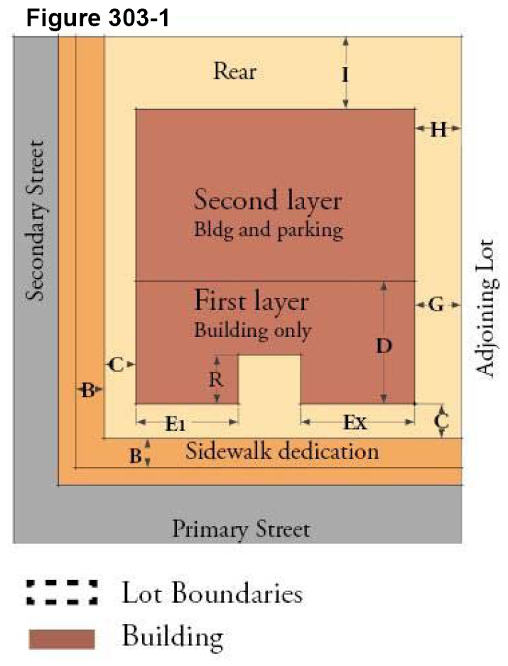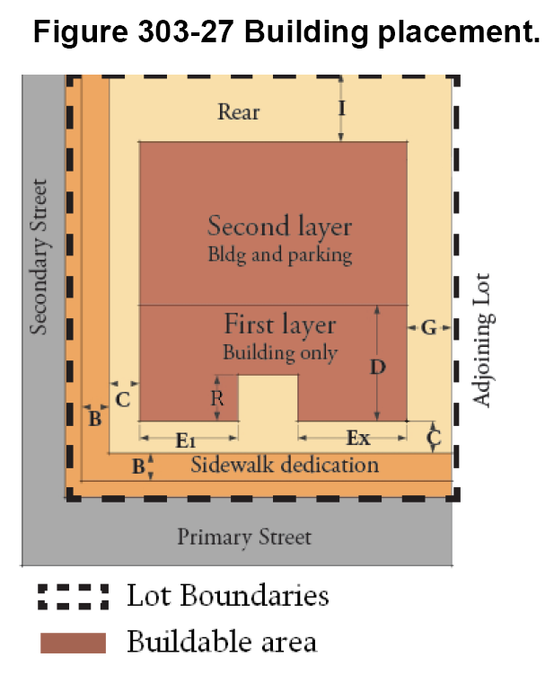The district standards in article 303 for each district specify build-to-lines, setbacks, minimum open space, and where parking facilities can be sited. Mandatory build-to-lines in lieu of minimum setbacks are one of the aspects that make these regulations form-based.