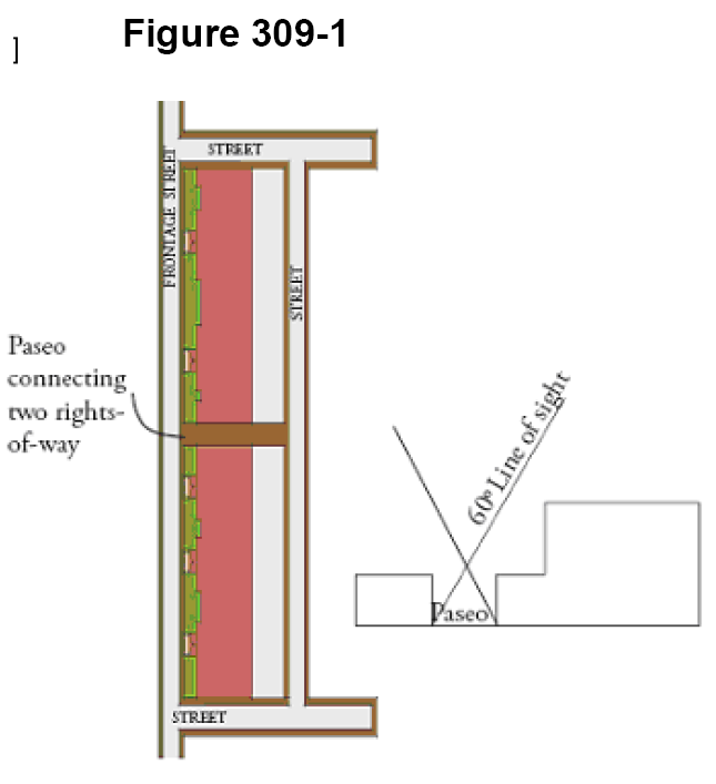 Building wall heights framing a paseo shall maintain a minimum sixty-degree clear sight line from the bottom of each wall framing the paseo, as illustrated in Figure 309-1.
