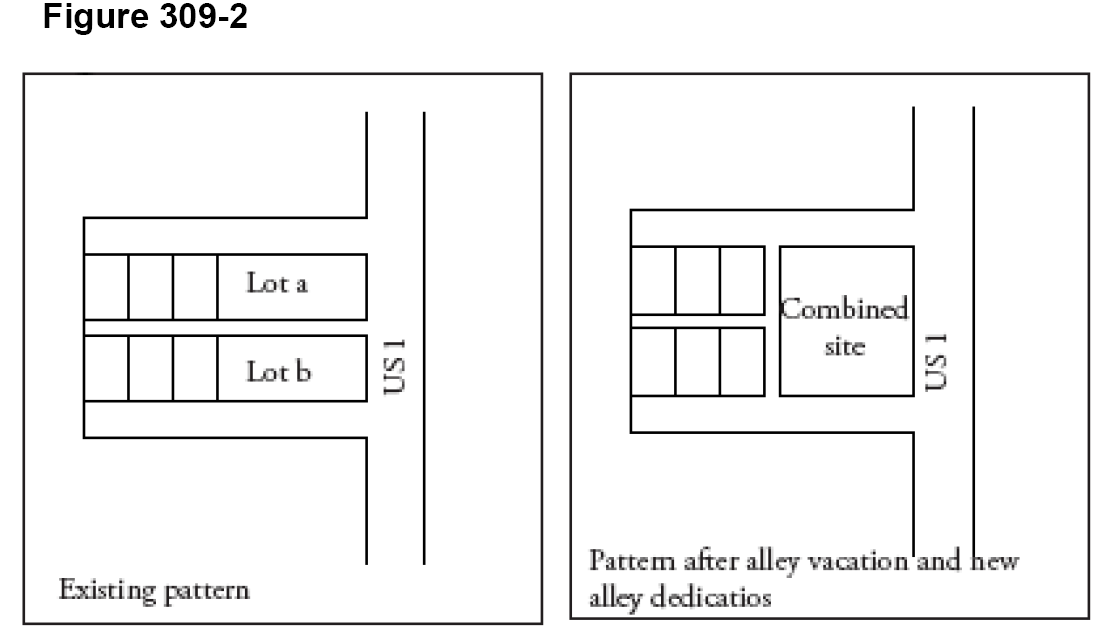 Vacation of alleys intersecting South Federal Highway is encouraged in order to improve traffic flow and safety conditions, and unify properties under common ownership with U.S. 1 frontage that are separated by alleys. Should the city commission approve an alley vacation, only the portion of the alley separating the U.S. 1 frontage properties should be vacated, and a new alley parallel to U.S. 1 should be dedicated at the back of the frontage properties between which the alley was vacated. See Figure 309-2 for illustration.