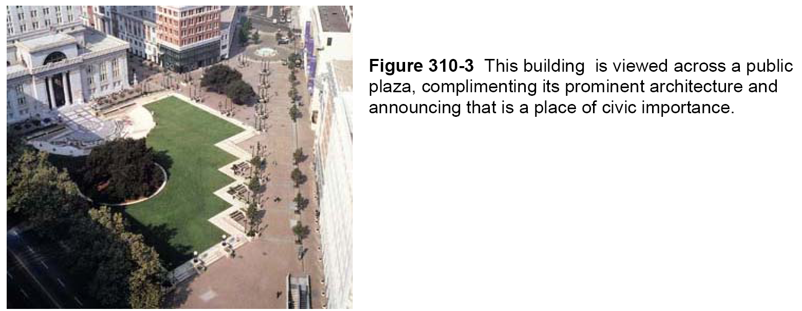 Access. Plazas should abut public areas and be physically and visually accessible from the public sidewalks. Security fences, walls, and entry gates should not block the sidewalk edge of the plaza or views into the plaza. The plaza shall be accessible to the public for at least the time of normal business hours. Vehicular access, loading, or parking within the plaza is prohibited. Emergency access drives will be considered through plaza upon review of integration into plaza design.