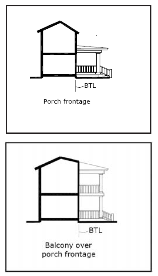 Stoop frontage. An exterior stair and landing at a building entrance that extends forward of the BTL as an encroachment, located close to the street line and elevated above the sidewalk, securing privacy for the windows and front rooms, and demarcating a vertical transition from public to private realms. This type is suitable for ground-floor residential use, and may be interspersed with the shopfront frontage type. The street setback for a stoop frontage shall be the depth of the stoop, in which case the stoop shall not encroach further than six (6) feet forward of the BTL. Upper-story balconies may extend up to four (4) feet forward of the BTL. A variety of stoop designs are possible.