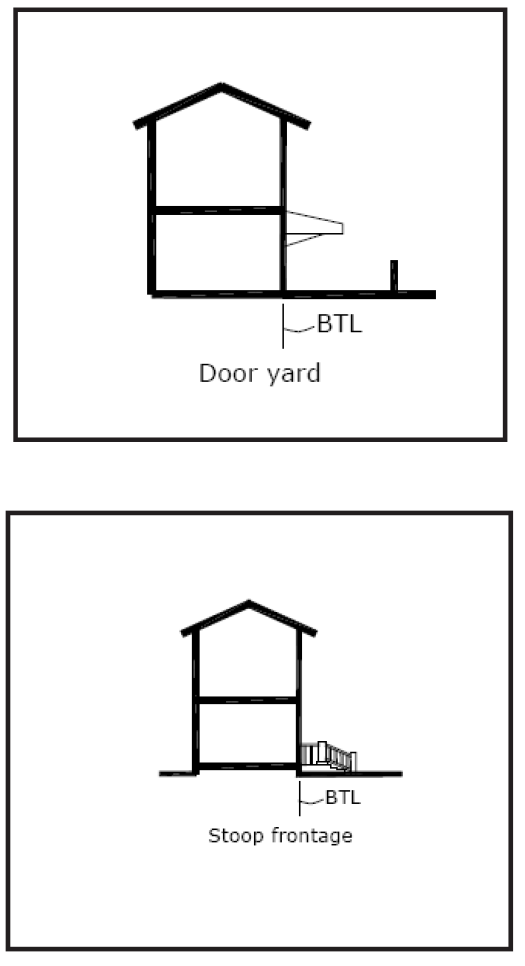 Dooryard frontage. A shallow yard open to the sky, separates the sidewalk and building façade. The yard may be at grade and separated from the sidewalk by a low decorative translucent fence of four (4) feet maximum height, or a terrace elevated above the sidewalk that may also utilize a low decorative translucent fence. Residential dooryards can be open for the use of the dwelling occupants, but should be landscaped for greatest privacy. A terrace is suitable for an outdoor café as the eyes of diners are at the same level as passersby on the sidewalk.