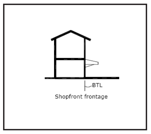 Shop frontage and modified shop frontage. A frontage in which a highly fenestrated façade is placed at or near the street line and the entrance is at sidewalk grade.