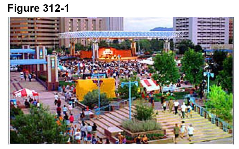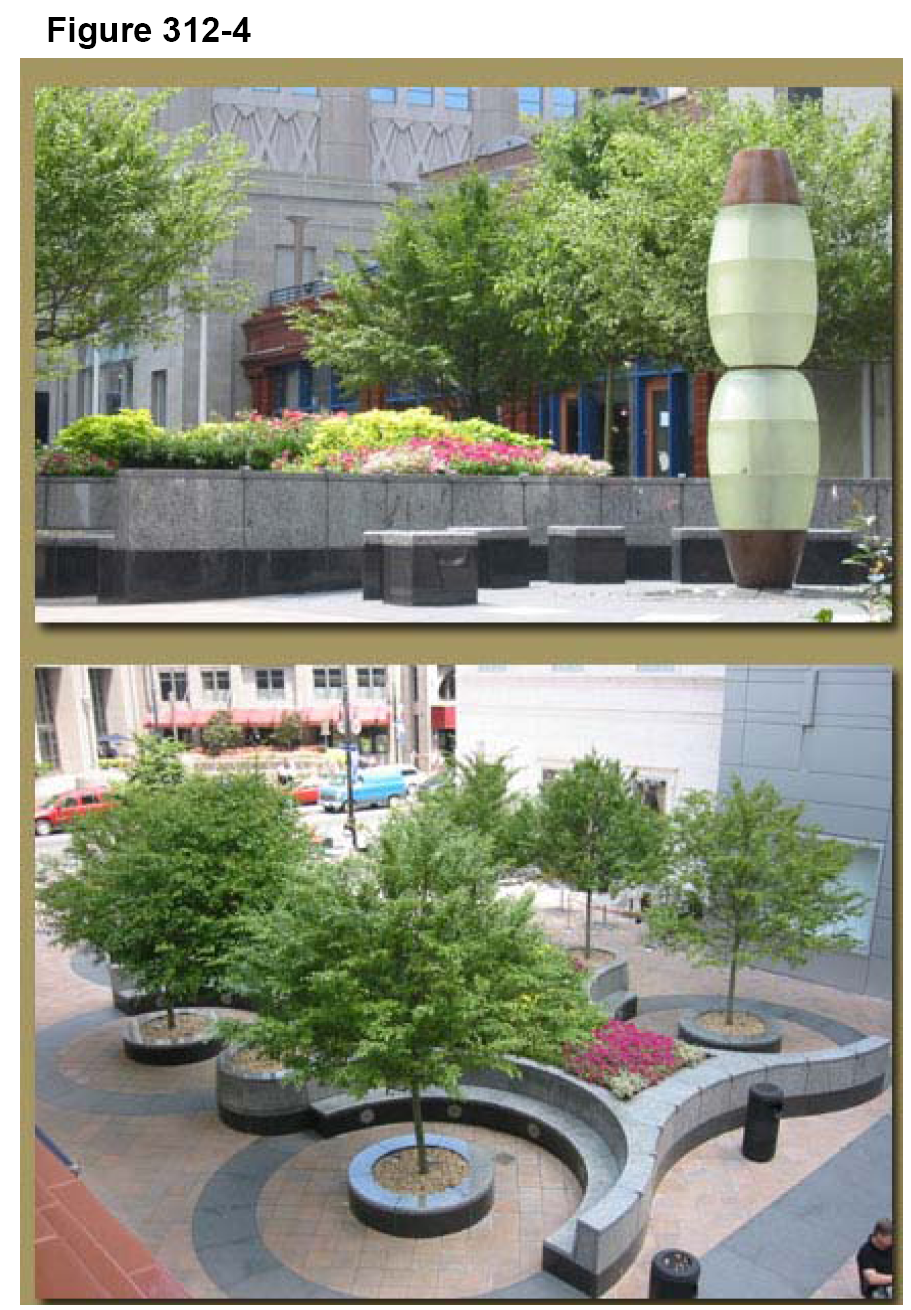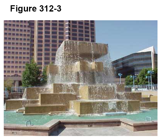 Water features. A water feature or public art is required for the open space incentive bonus. The use of water, in a variety of forms adds aesthetic value to the area and a sense of respite. Water features help to mask inhospitable noise, direct attention, cool the microclimate of a space and create a positive image of the area. They can be freestanding features or attached to a building wall. The visual aesthetic shall be carefully considered when designing water features. A variety of water feature effects are encouraged, such as the use of bubblers, sprays, falls, and mists. Lighting should accompany water features to add visual interest during nighttime hours and additional security. All water features must conform to local codes and regulations, and shall not have exposed mechanical or electrical equipment.