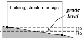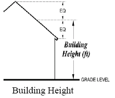 Building height. The vertical extent of a structure measured (in feet) from the average elevation of the finished grade surrounding the structure to the highest point of the structure. The highest point of the structure will vary with the type of roof as follows: The vertical distance from the finished grade of the highest roof beams on a flat or shed roof, to the deck level or a mansard roof; and the average distance between the eaves and ridge level for gable, hip and gambrel roofs.