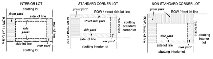 Yard, front. An open, unoccupied space on the same lot with the main building, extending the full width of the lot and situated between the right-of-way line and the front line of the building projected to the side lines of the lot. The depth of the front yard shall be measured between the front lines of the building and the right-of-way line.