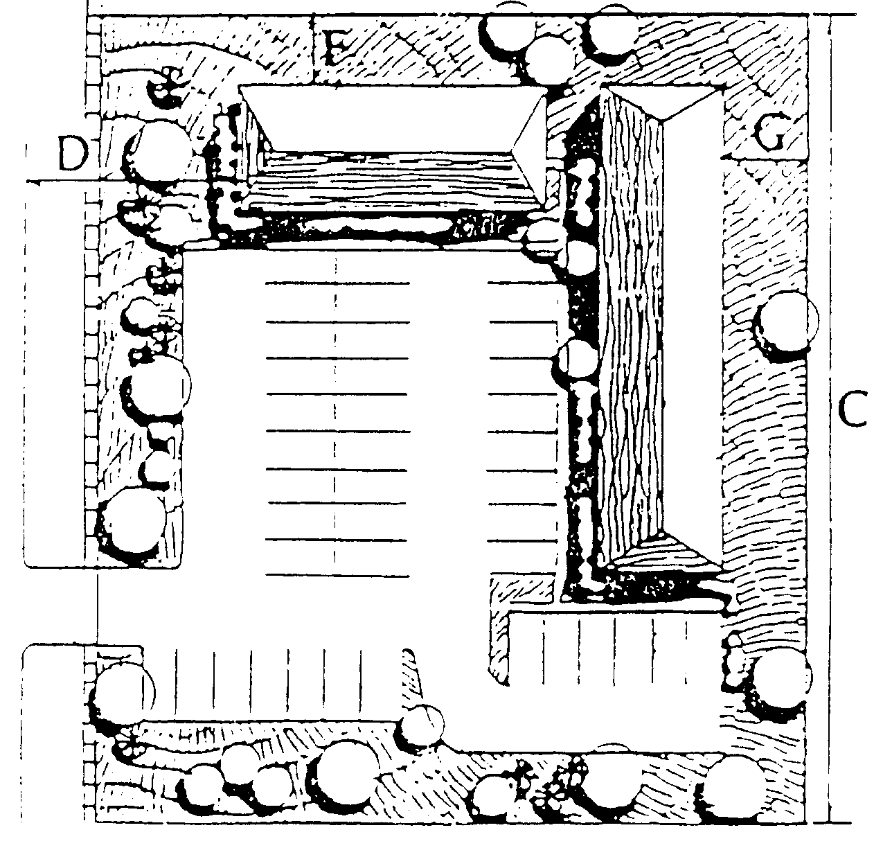(E) Patio House: This dwelling type is a detached or semidetached unit for a single family with one (1) dwelling unit from ground to roof. Each dwelling unit's lot shall be fully enclosed by a wall located at the lot line, thus creating a private yard between the house and the wall. Front, side and rear walls shall be a maximum of six (6) feet in height. That portion of the yard or patio area comprising "minimum patio area" is this housing type's minimum yard area. All living spaces, such as livingrooms, dens and bedrooms, shall face into the yard or patio. Patio houses shall be located on a cul-de-sac or an internal parking lot. The following table specifies the minimum standards for a patio house. A patio house is permitted only in planned developments as provided in section 12-32.