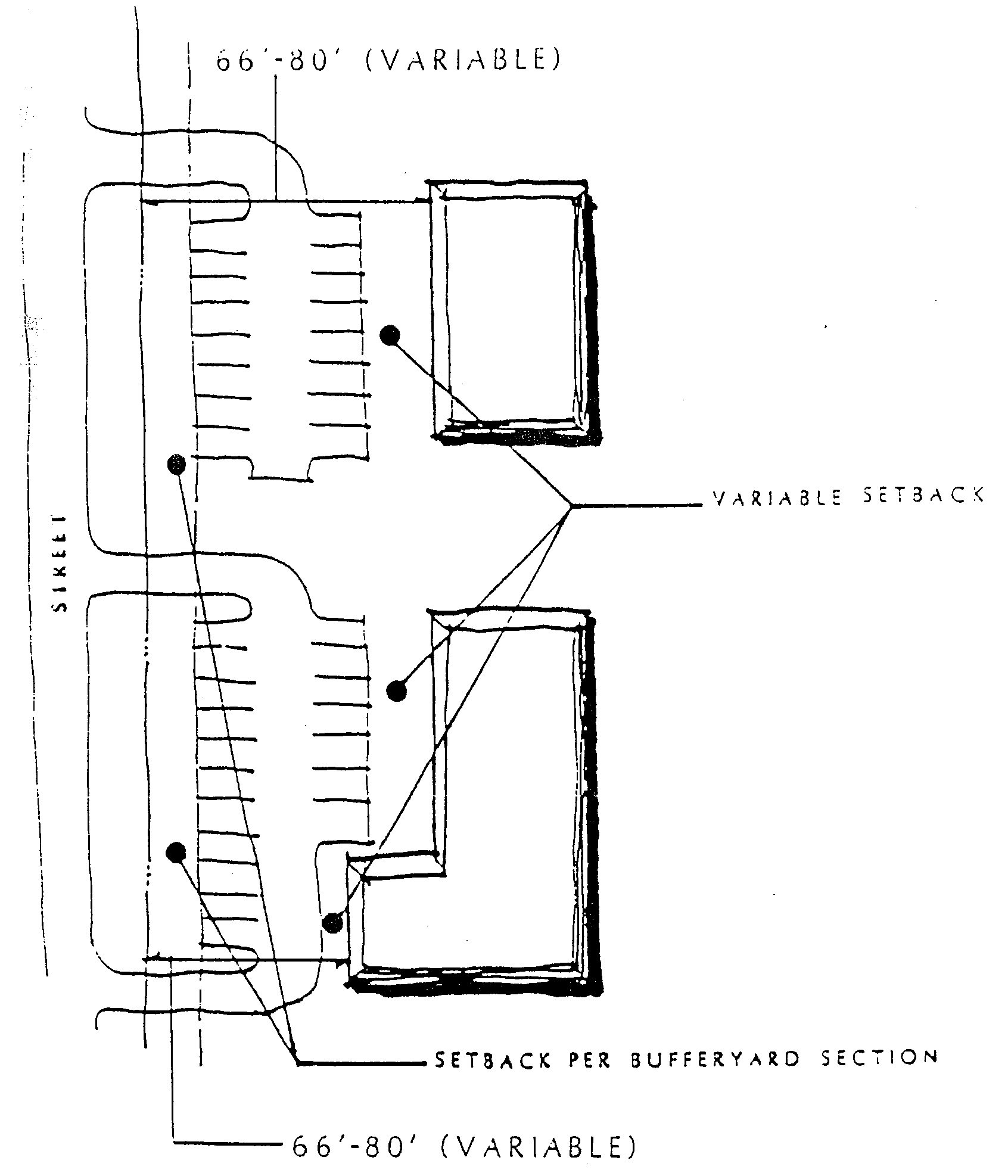 Where buildings are set back to the rear of an off-street parking area or in L-shape to the rear of such parking areas, the minimum building setback shall be sixty-six (66) feet to eighty (80) feet, based on the treatment between edge of curb and building and the landscape treatment as shown in Illustration 12-84B.