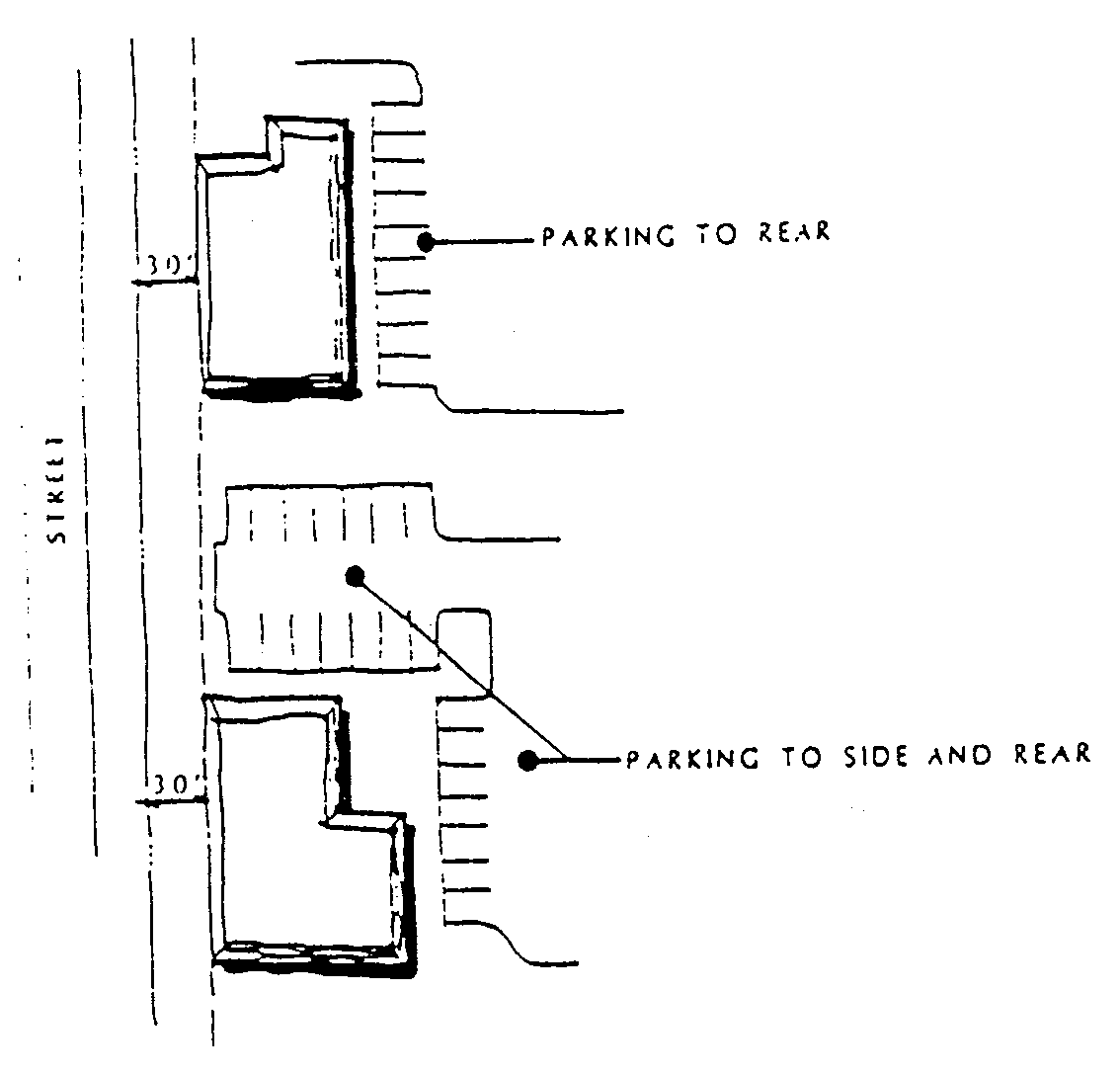 Where buildings are located between the street and off-street parking areas or with off-street parking to the rear and side of the building, the standard setback shall be thirty (30) feet, as shown in Illustration 12-85A, and an entrance walk provided from the street right-of-way to the buildings.