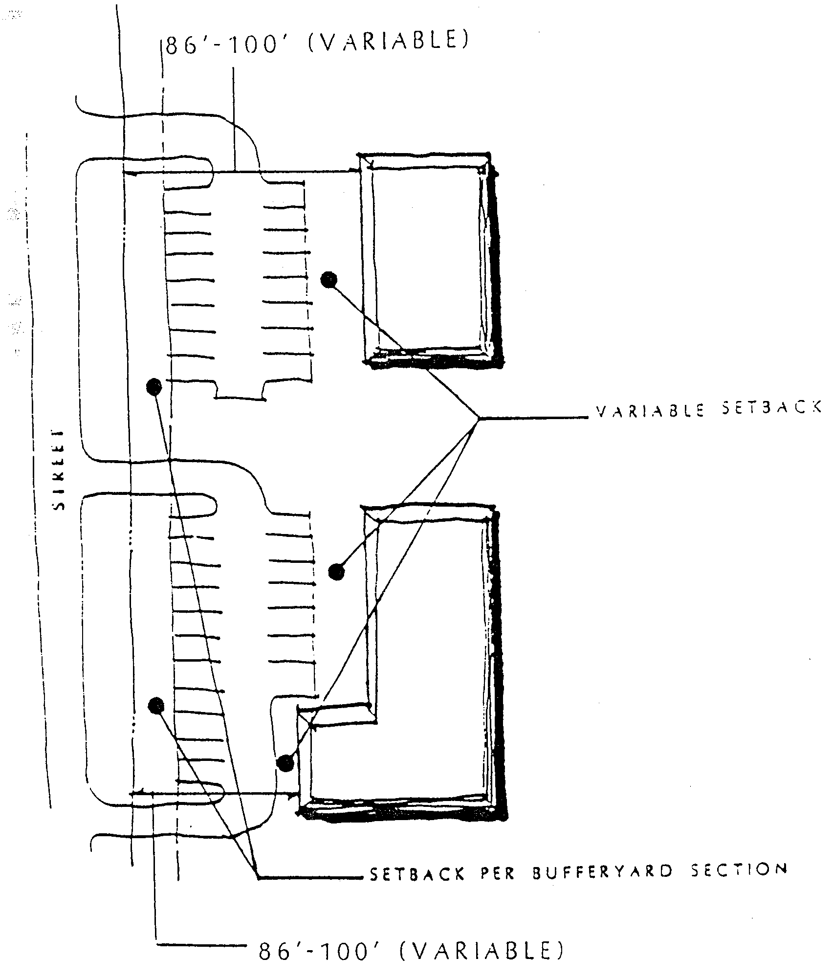 Where buildings are set back to the rear of an off-street parking area or in L-shape to the rear of such parking areas, the minimum building setback shall be eighty-six (86) feet to one hundred (100) feet, based on the treatment between edge of curb and building and the landscape treatment as shown in Illustration 12-85B.