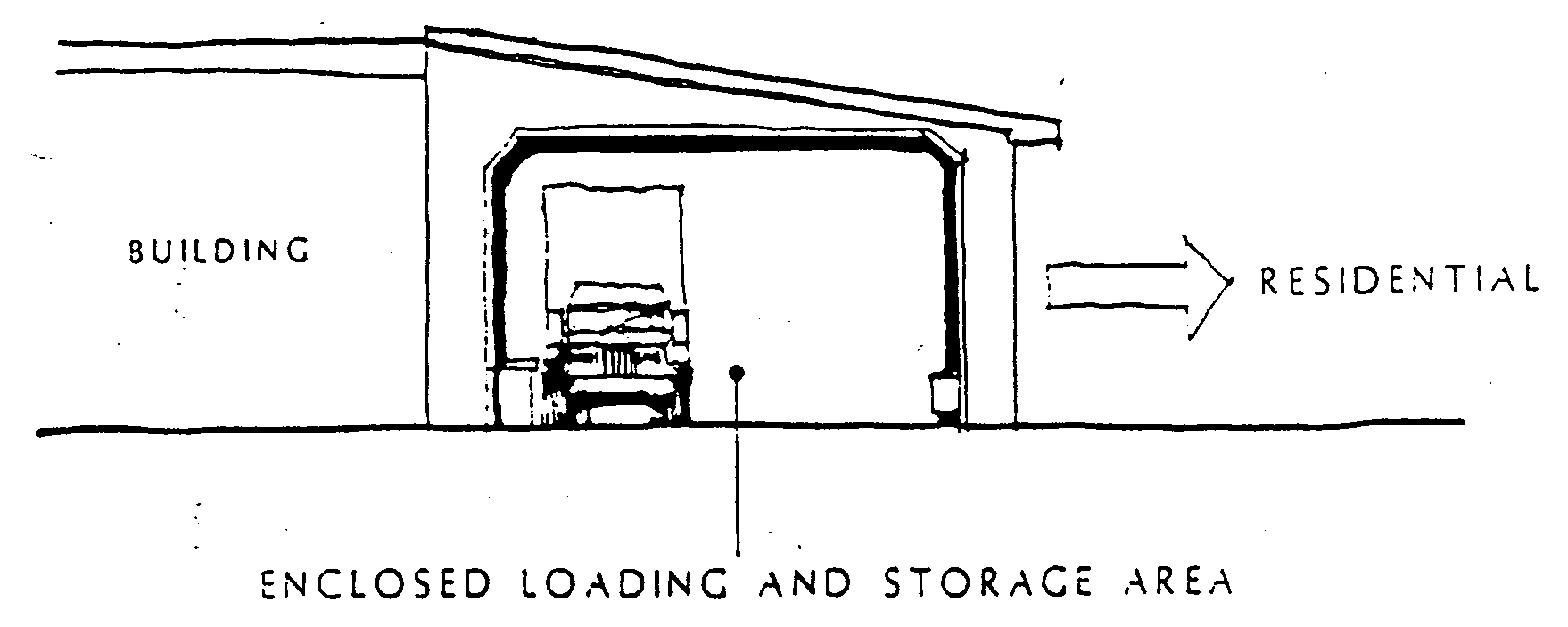 Where a loading area or trash area faces a residential district, the minimum buffer standards in article VI shall be increased by two-tenths (0.2) opacity rating, unless the loading areas and storage are enclosed as illustrated in Illustration 12-86A.