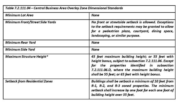 Table 7.2.111.04 Central Business Area Overlay Zone Dimensional Standards
