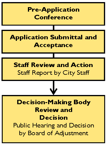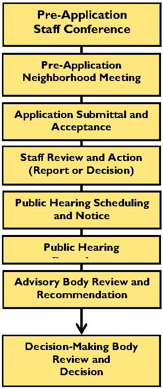 Table 3.2, Summary of Development Procedures, identifies the various development permits authorized by this Code and indicates the role staff and City boards have in making recommendations or decisions on applications for each type of development permit. It also identifies those applications that require a public hearing, and the type of public hearing (standard or quasi-judicial) involved. Also noted is whether a pre-application staff conference or neighborhood meeting is required. Reading table rows from left to right provides a summary view of the major steps involved with each type of application for a development permit.