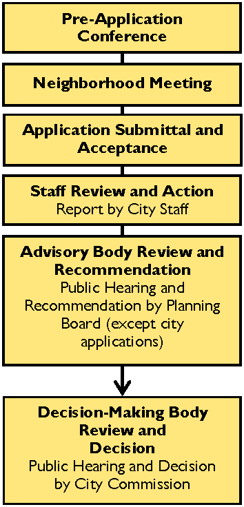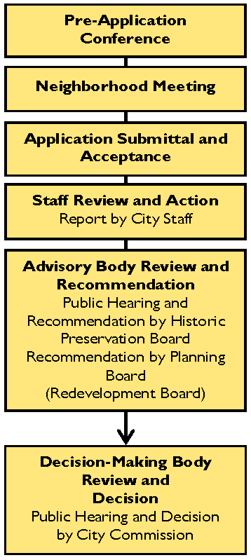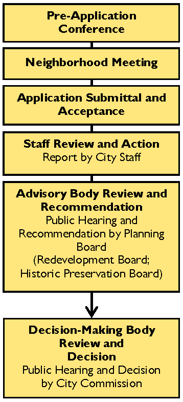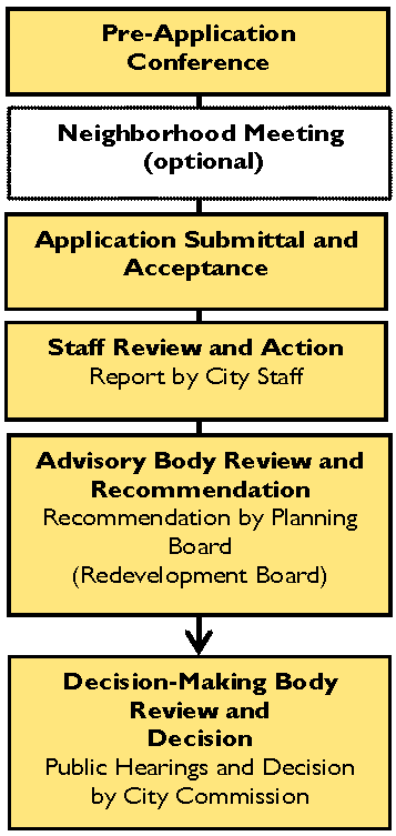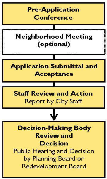Neighborhood Meeting Mandatory. A neighborhood meeting is required after the pre-application staff conference and at least 21 days before any of the following applications is reviewed by an advisory body or a decision-making body (if no advisory body review is involved). This requirement does not apply if the application is one initiated by the Planning Board, a Redevelopment Board, the Historic Preservation Board, or City staff.