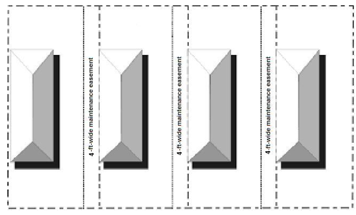 A four-foot-wide maintenance easement shall be provided on the adjoining lot, running along and around the corners of the dwelling located along the zero lot line. Roof overhangs may extend up to 2 feet into the easement provided the roof and roof drainage facilities are designed to limit water runoff from the roof to the area of the maintenance easement. Fences or walls are prohibited within the easement.