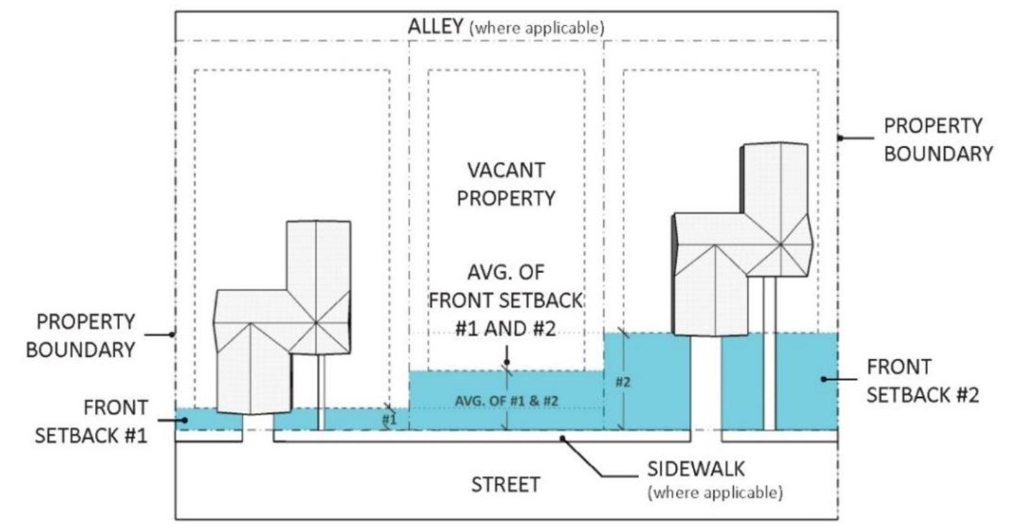 When a vacant lot is bordered on two sides by lots with existing principal buildings or structures, either of which do not meet the front setback requirements for the zone district, the required front setback for the vacant lot shall be the average of the front setbacks of the buildings or structures on the adjoining lots.