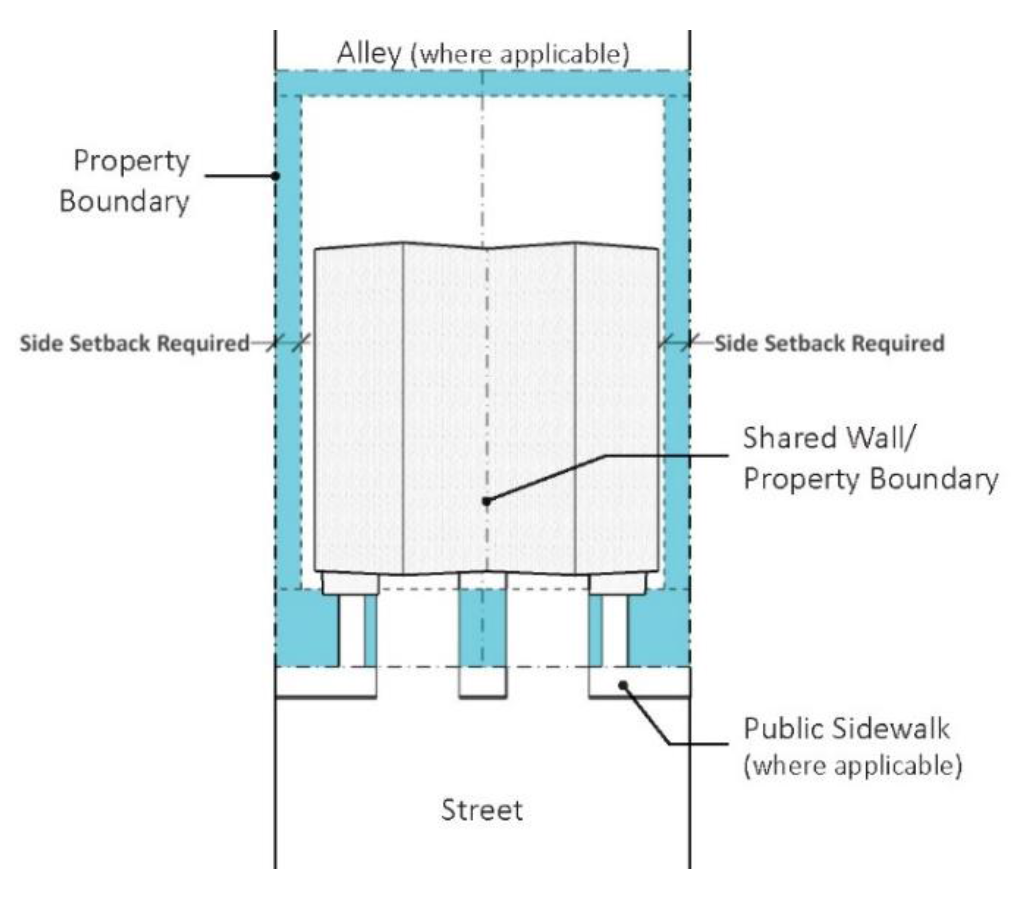 When buildings share a common wall (e.g., a duplex), only those buildings that do not share a common wall need observe the required side setback for the zone district.