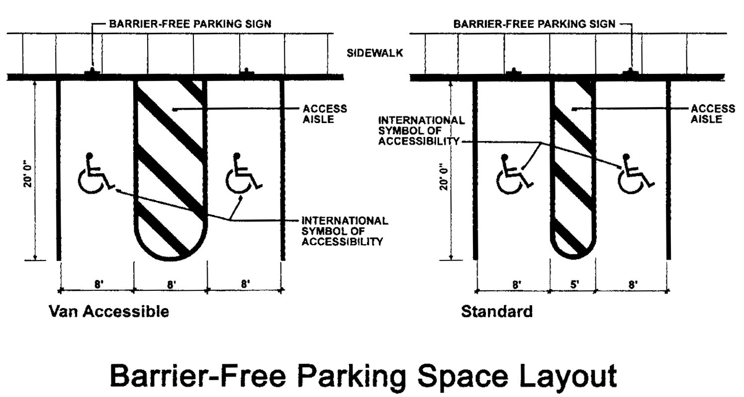 Barrier-free parking requirements. Barrier-free parking spaces shall be provided per federal ADA requirements from the U.S. Department of Justice's ADA Business Brief: Restriping Parking Lots. These requirements are summarized in the following table.
