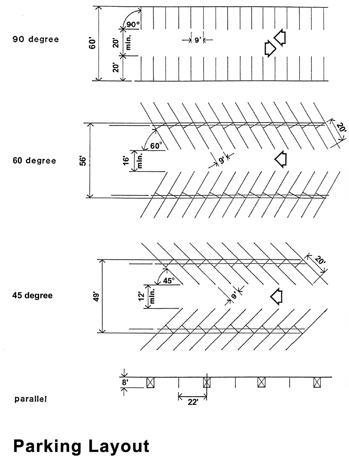 Parking layout. The layout of off-street parking facilities shall be in accordance with the following minimum requirements and the graphic on the following page: