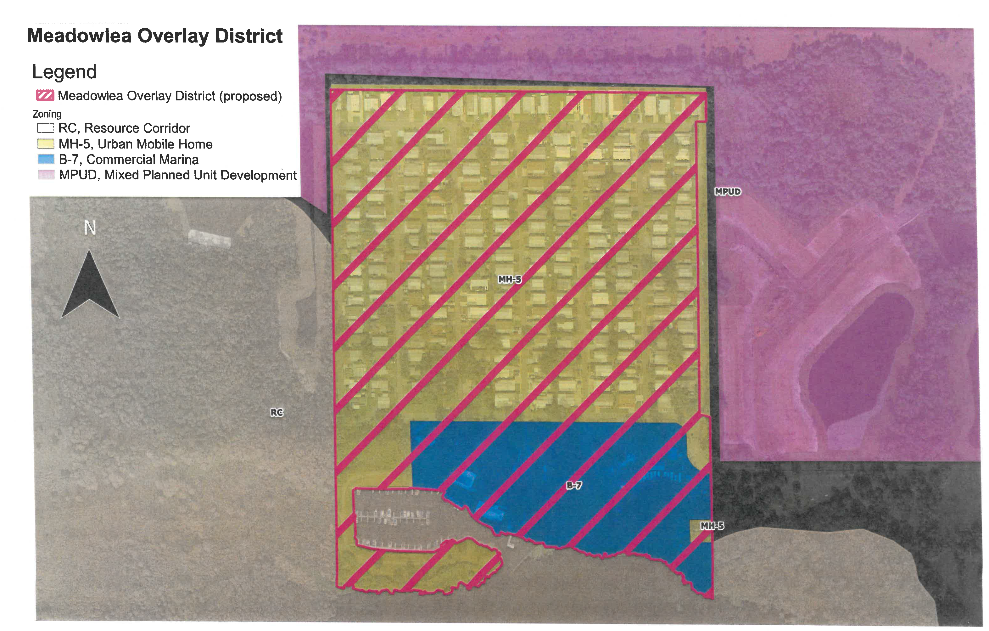 The purpose of the Meadowlea Overlay District is to provide alternative setback requirements to facilitate the installation of newer mobile home dwellings on lots within such district. Due to the average lot size within such district and changes in the size and configuration of modern mobile homes, such installations, as proposed, often do not meet the setback requirements imposed by the MH-5 Urban Mobile Home Classification. This overlay district seeks to provide relief to accommodate the installation of newer mobile home units on the lots located within such subdivision.