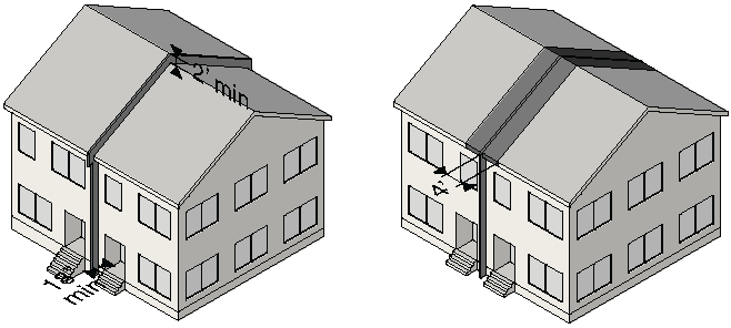 Each townhouse shall be considered a separate building and shall be completely separated from any adjoining dwelling by use of a masonry wall that provides a fire resistant rating of not less than 2 Hours; or a wall that provides a fire resistance rating of not less than 2 Hours tested in accordance with ASTM E 119 or UL 263 with exposure from both sides and an approved automatic sprinkler system in accordance with NFPA 13.